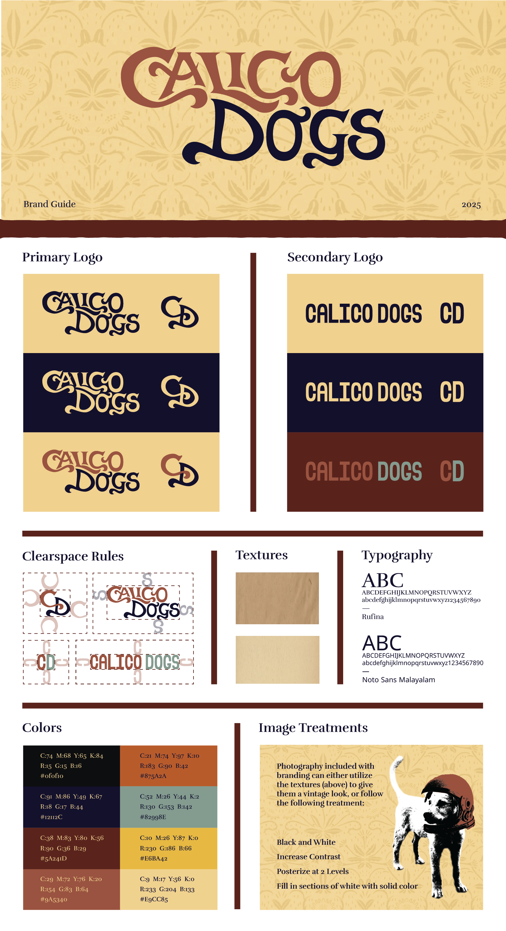 Calico Dogs wanted elements of their logo to be done by hand. Due to this, I began the design process by creating mood board using photography they provided and found objects, imagery, and textures. Vintage illustrations and advertisements guided my design choices. Hand lettering became my primary mode of creation, with both the primary and secondary logo being hand lettered.