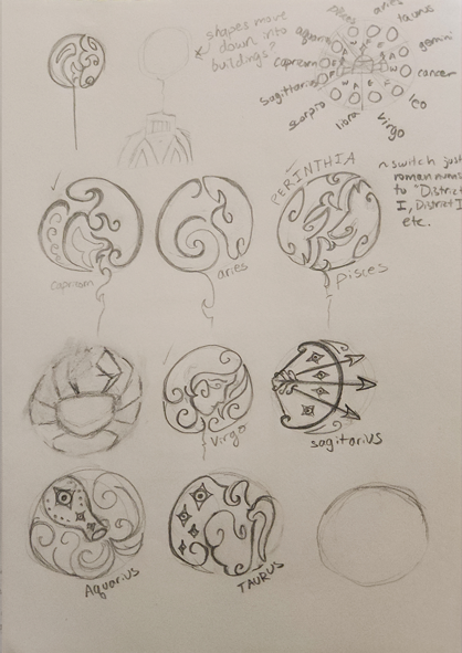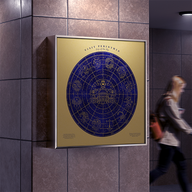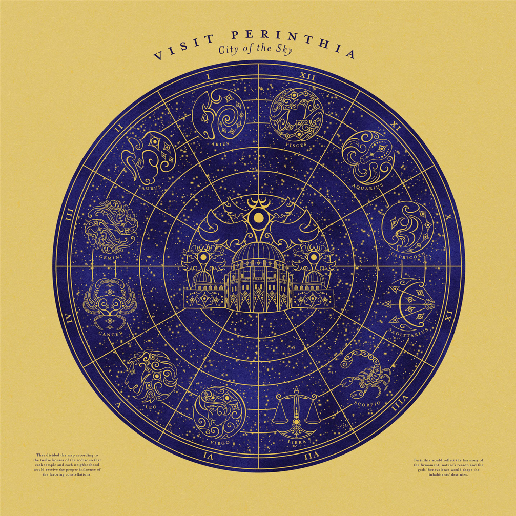 I decided that the travel poster should resemble a star chart. Perinthia was made by scientists based on the heavens, and so it would only make sense to have a travel poster that was orderly, quiet, and resembled the heavens, too. The thin lines of the chart and the round nature of stars inspired the form of the icon system that I would draw for the twelve zodiacs. The concept of biblically accurate angels led me to incorporate the use of eyes everywhere. They are within each of the zodiacs as a core design element, and they became the watchful eyes of the city's capital building that was placed in the center of the design itself.