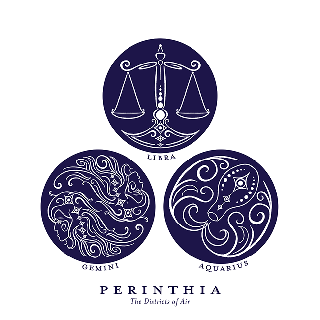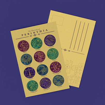 With the icon system and additional illustration of Perinthia’s capital, I was able to develop a color system. These colors correlate to the zodiac types - water, fire, earth, and air. The yellow background on the postcards is the same as the travel poster, tying together the ephemera aesthetically.