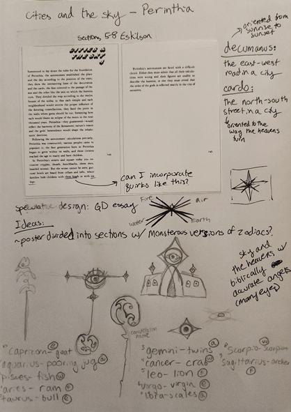 I began by posting the text within my notebook and taking notes from the text itself. I defined words I didn't understand and began doodling possible ideas. The idea of the heavens stuck in my mind, and I began to think about the concept of angels. More specifically, I began to think about biblically accurate angels. Within the bible, angels are often described to have multiple eyes, with large rings and sometimes multiple faces. They were fearsome beings, but also comforting and protective. This idea of multiple eyes stuck with me as I began to create a mood board and explore images of biblically accurate angels. Perinthia is described to have people born there with multiple limbs, so the possibility of people being born there with multiple eyes was not far off.