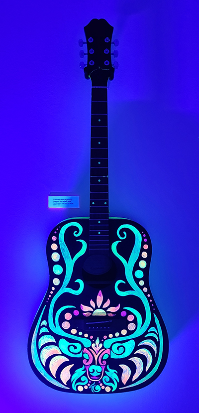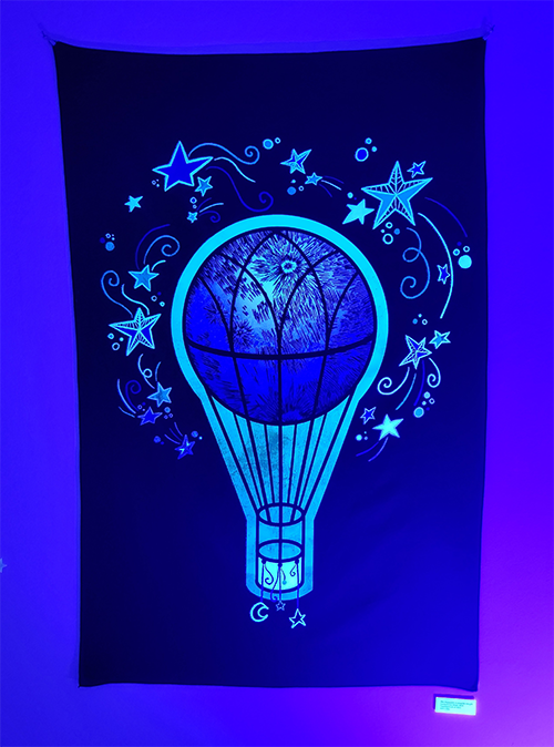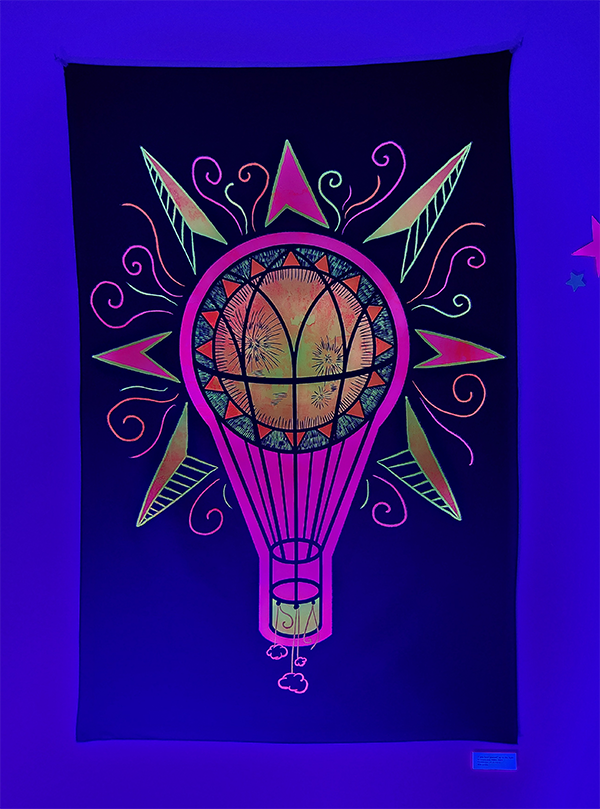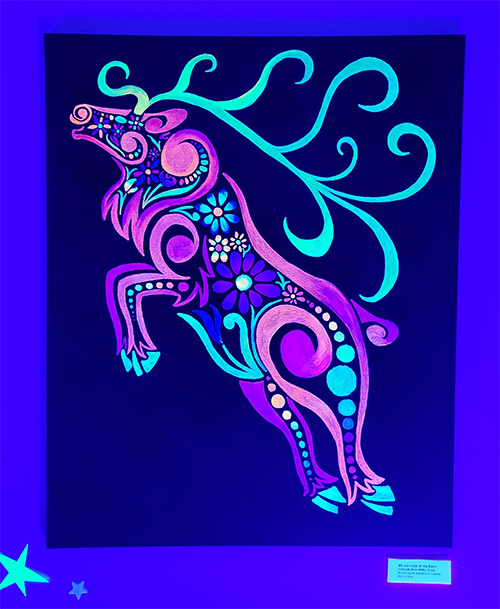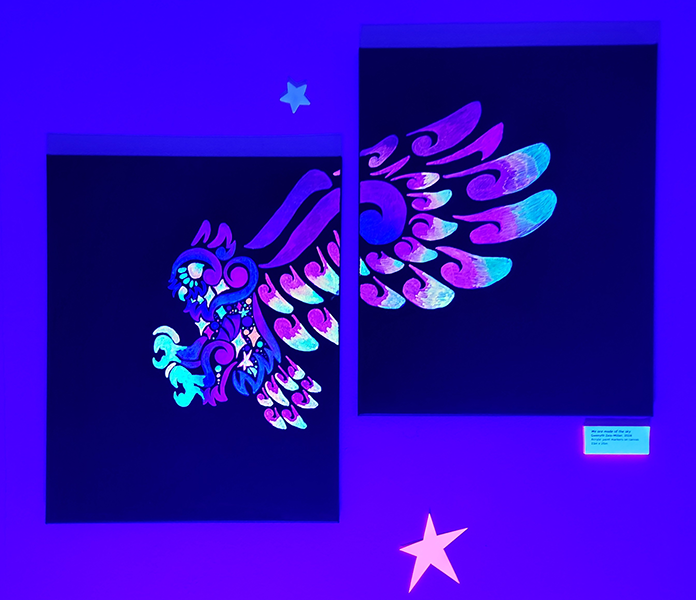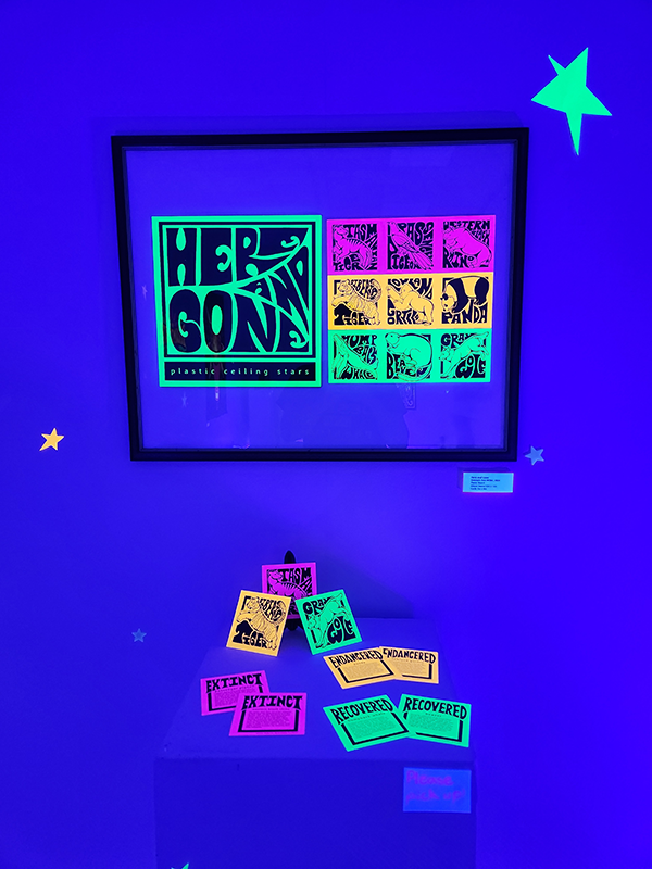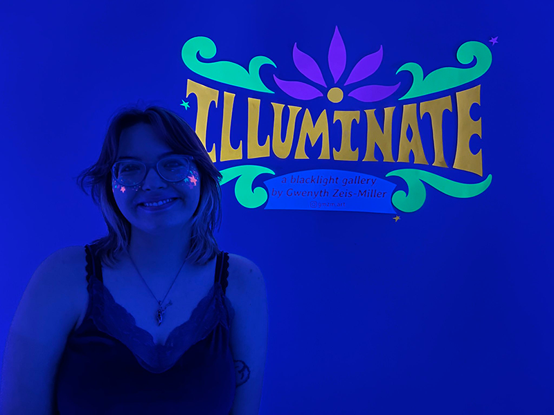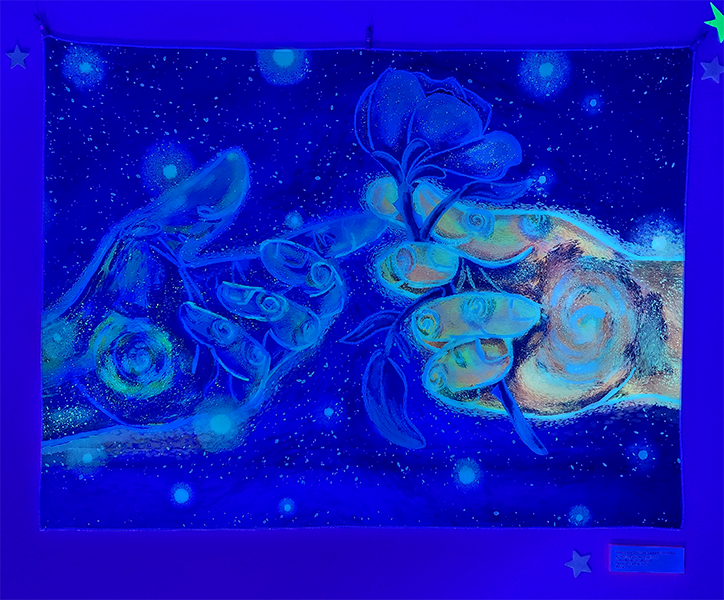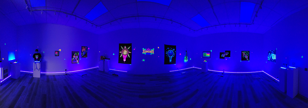 “Illuminate” was a black light gallery that took place from September 28th, 2024 to October 4th, 2024 in the Waldo Bates Student Gallery. I began working with fluorescent art due to my parents, who owned a collection of black light posters in the 90s that they then passed on to me. The vivid colors and atmosphere that black lights produce fascinated me, and I spent considerable time researching how to reproduce fluorescent effects. This was a culmination of my efforts.