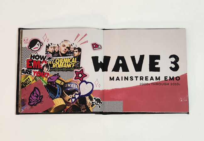 "The 5 Waves of Emo" is a book detailing the history of the emo music genre. It also highlights bands from each era with interactive foldouts. As one of my favorite genres of music, I wanted to make sure I was properly paying tribute to the bands that have defined the past five decades.