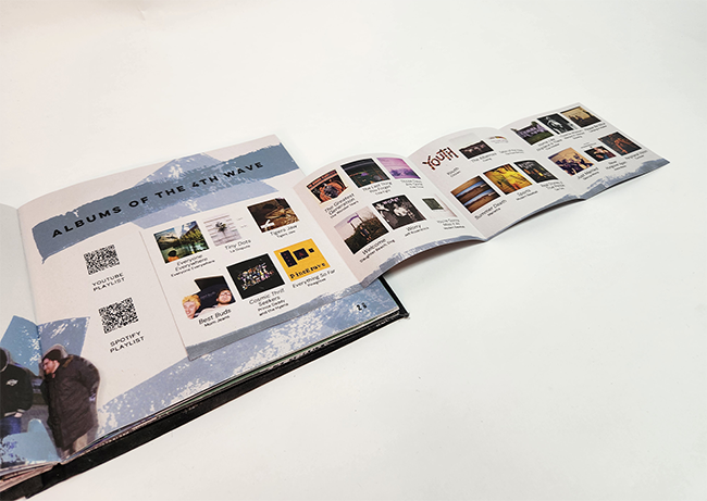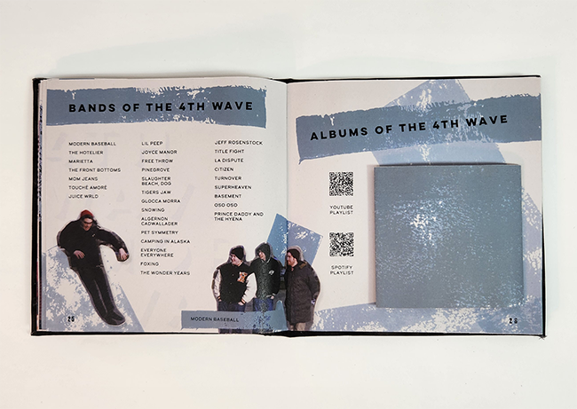 When a design is made online, there is only so much that can be interacted with. Print in its tactile form gives way to much more fun elements to touch and experience. When I decided to create a section of this book that shares album covers from each wave of emo music, I knew it was the perfect opportunity to add interactivity. Each section has a foldout that allows the viewer to explore the wave more in depth. If I had displayed the information in a more traditional way, it would have added pages of monotonous information. This method is a bit more fun and space saving!