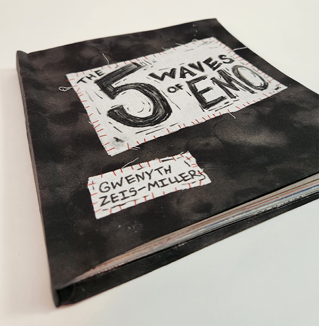 The most important aspect of a printed work is how it exists in the world. Print is meant to be interacted with. Everything from the look to the feeling of a final printed product in your hand matters. When finishing this book, I decided to make the cover out of fabric and to hand make the title as a patch that I then sewed on. As I said before, much of emo culture is based around DIY ethos. A common clothing trend is to wear jackets, vests, and pants decorated with patches. Having a patch sewn onto the cover with real stitching that the viewer can feel adds an element of authenticity to the final product. Overall, print is an entire package experience, and the cover should be taken just as seriously as the contents of the work.